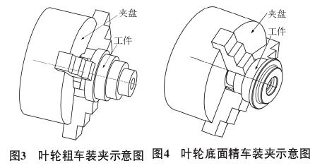 該葉輪分4次裝夾,毛坯選用圓柱棒料,第1次裝夾采用三爪夾盤(pán)夾持,完成葉輪打孔和粗車(chē);第2次裝夾采用