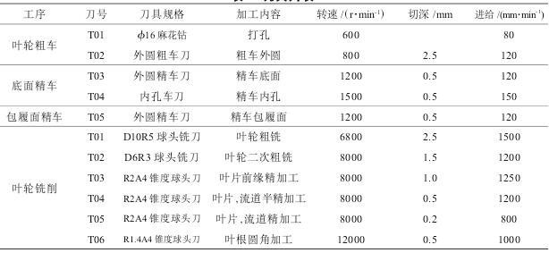 三爪夾盤(pán)夾持,完成葉輪底面臺(tái)階圓、臺(tái)階孔精車(chē);第3次裝夾采用三爪夾盤(pán)和軟爪夾持,完成葉輪孔和輪轂的精車(chē);第4次裝夾采用專(zhuān)用夾具夾持,完成葉輪銑削加工。工藝路線(xiàn)制定如下:1)備料。0Cr17Ni4Cu4Nb棒料,尺寸為220 mm×95 mm。2)打孔。在數(shù)控車(chē)床上用三爪夾盤(pán)夾持,打孔直徑為16 mm,深度貫通。3)粗車(chē)。粗車(chē)葉輪輪轂面,留2 mm精車(chē)余量。4)精車(chē)葉輪底面。在數(shù)控車(chē)床上零件掉頭,用三爪夾盤(pán)夾持,精車(chē)葉輪底面臺(tái)階外圓和臺(tái)階孔。5)精車(chē)葉輪包履面。在數(shù)控車(chē)床上用三爪夾盤(pán)和軟爪夾持。葉輪底面臺(tái)階外圓,精車(chē)內(nèi)孔和輪轂面。6)葉輪粗銑。在五軸聯(lián)動(dòng)加工中心上用專(zhuān)用夾具夾持,粗銑葉輪,流道方向和葉片方向各留0.5 mm精銑余量。7)粗銑葉片前緣。粗銑葉片前緣,留0.5mm精銑余量。8)葉片半精加工。半精加工葉片,葉片方向留0.2 mm精銑余量,流道方向留0.5 mm精銑余量。9)流道半精加工。半精加工流道,流道方向留0.2 mm精銑余量,葉片方向留0.5 mm精銑余量。10)葉片精加工。精加工葉片至零件圖樣要求。11)流道精加工。精加工流道至零件圖樣要求。12)葉根圓角精加工。精加工葉根圓角至零件圖樣要求。